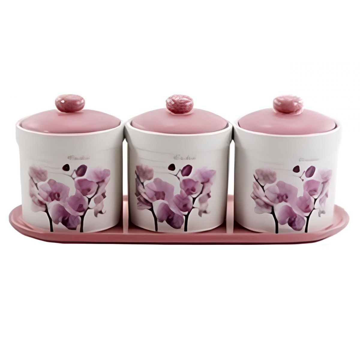 Набір із трьох керамічних банок для сипучих продуктів об'ємом 500 мл із керамічною підставкою, модель ZFC 048C OP, у кольорі орхідеї рожевого відтінку.