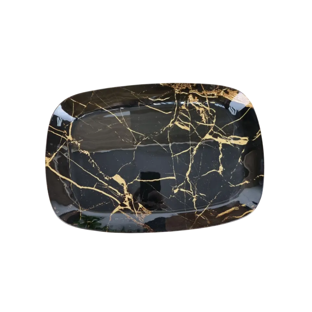 Стильна прямокутна скляна страва з дизайном «чорний мармур» призначена для ефектної подачі закусок, десертів, фруктів та святкових страв. Сучасний зовнішній вигляд дозволяє використовувати її як у домашніх умовах, так і в ресторанах або для банкетної сервіровки.