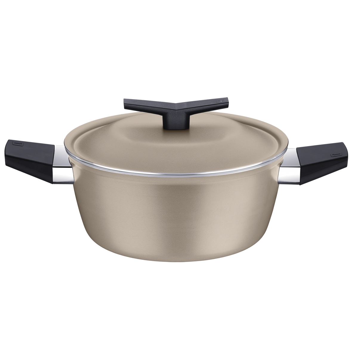Ручки з бакеліту з покриттям Soft-touch не нагріваються під час приготування та забезпечують комфортне й безпечне використання. У комплект входить алюмінієва кришка, яка щільно прилягає до корпусу.