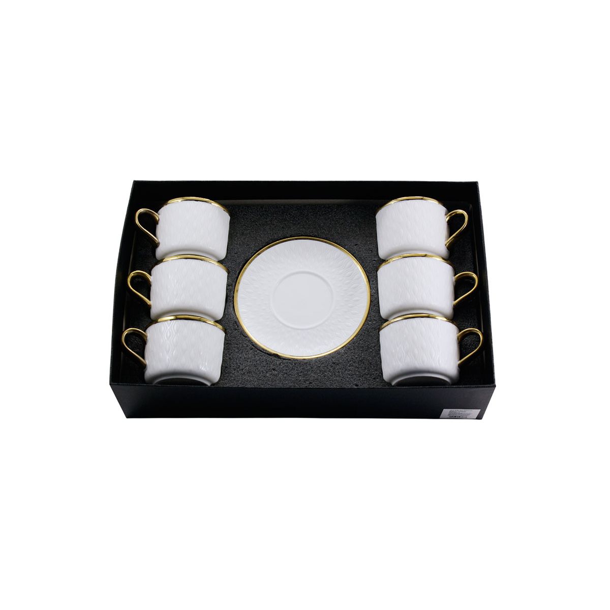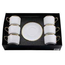 Чашки виконані з високоякісної тонкостінної фарфорової маси білого кольору, що надає комплекту святкового і вишуканого вигляду. Поверхня прикрашена рельєфним візерунком та тонкою золотистою облямівкою, що підкреслює естетику і робить сервіровку особливою.