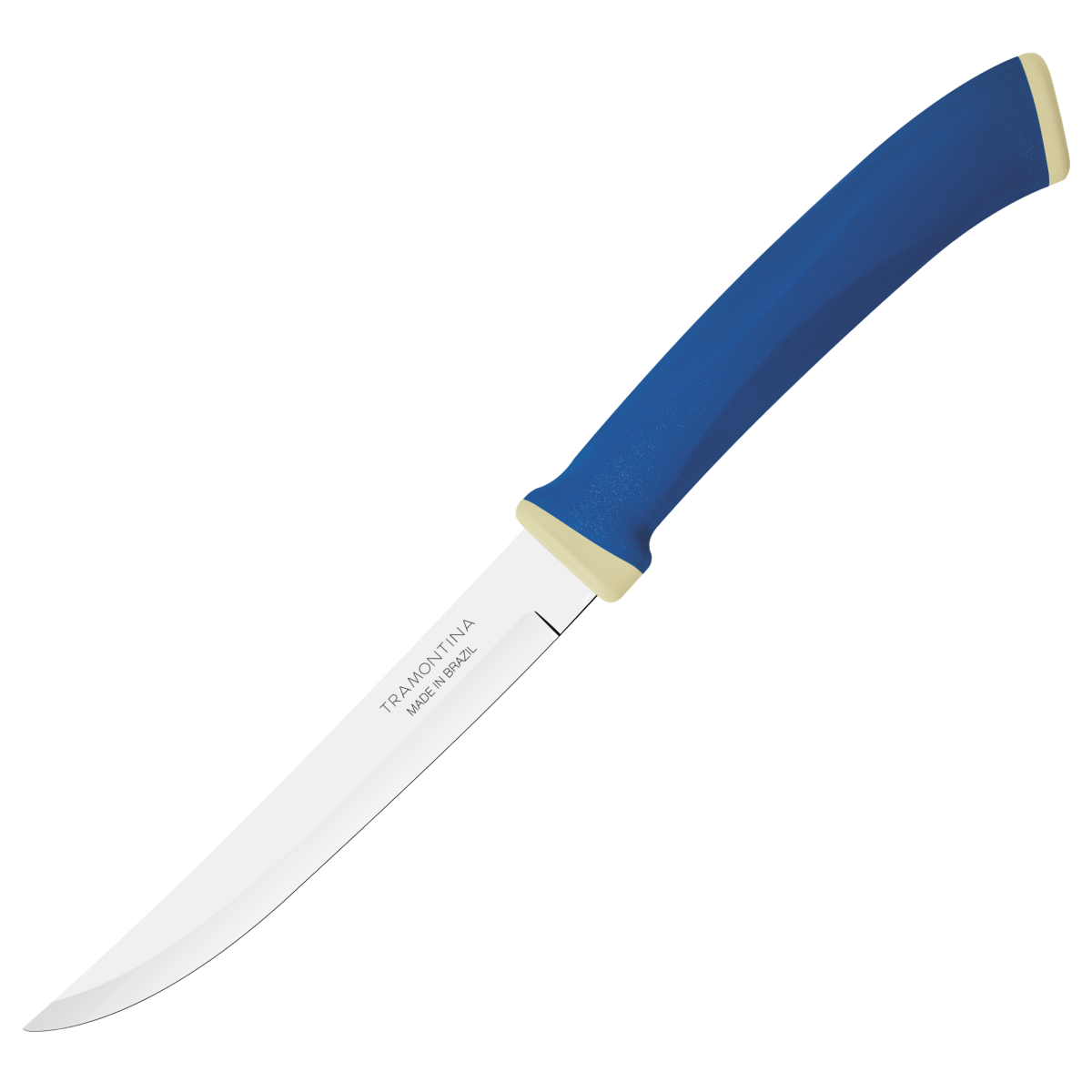 Ніж для стейка Tramontina Felice Blue, 112 мм (23493/115) — це практичний столовий ніж, призначений для зручного нарізання готового м’яса, зокрема стейків. Він поєднує простоту, надійність і якість бренду Tramontina, відомого кухонним приладдям у багатьох країнах світу.