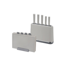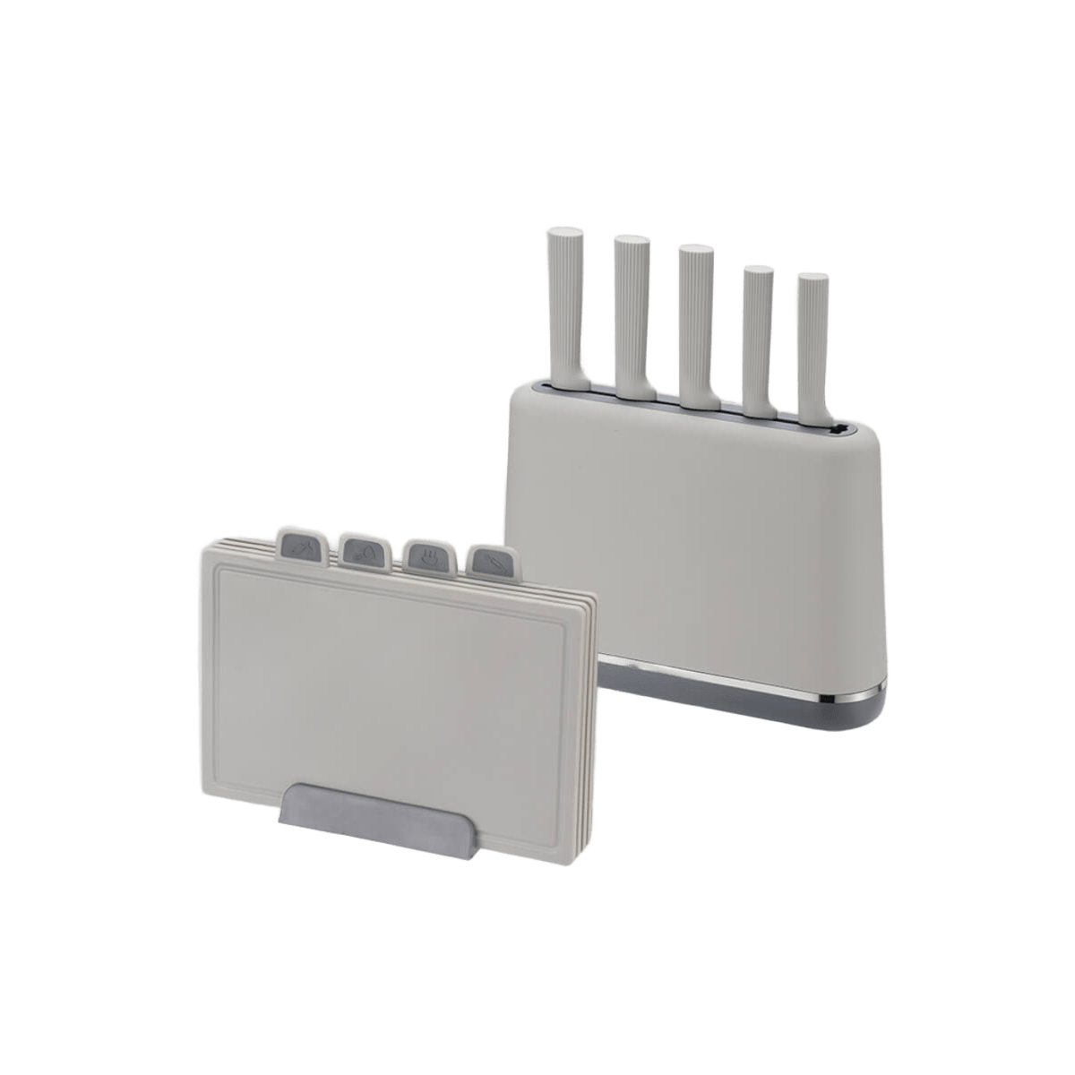 Підставка обертається на 360°, економить місце на робочій поверхні й дає миттєвий доступ до потрібного ножа чи дошки. Сучасний сірий колір гармонійно виглядає на будь-якій кухні.