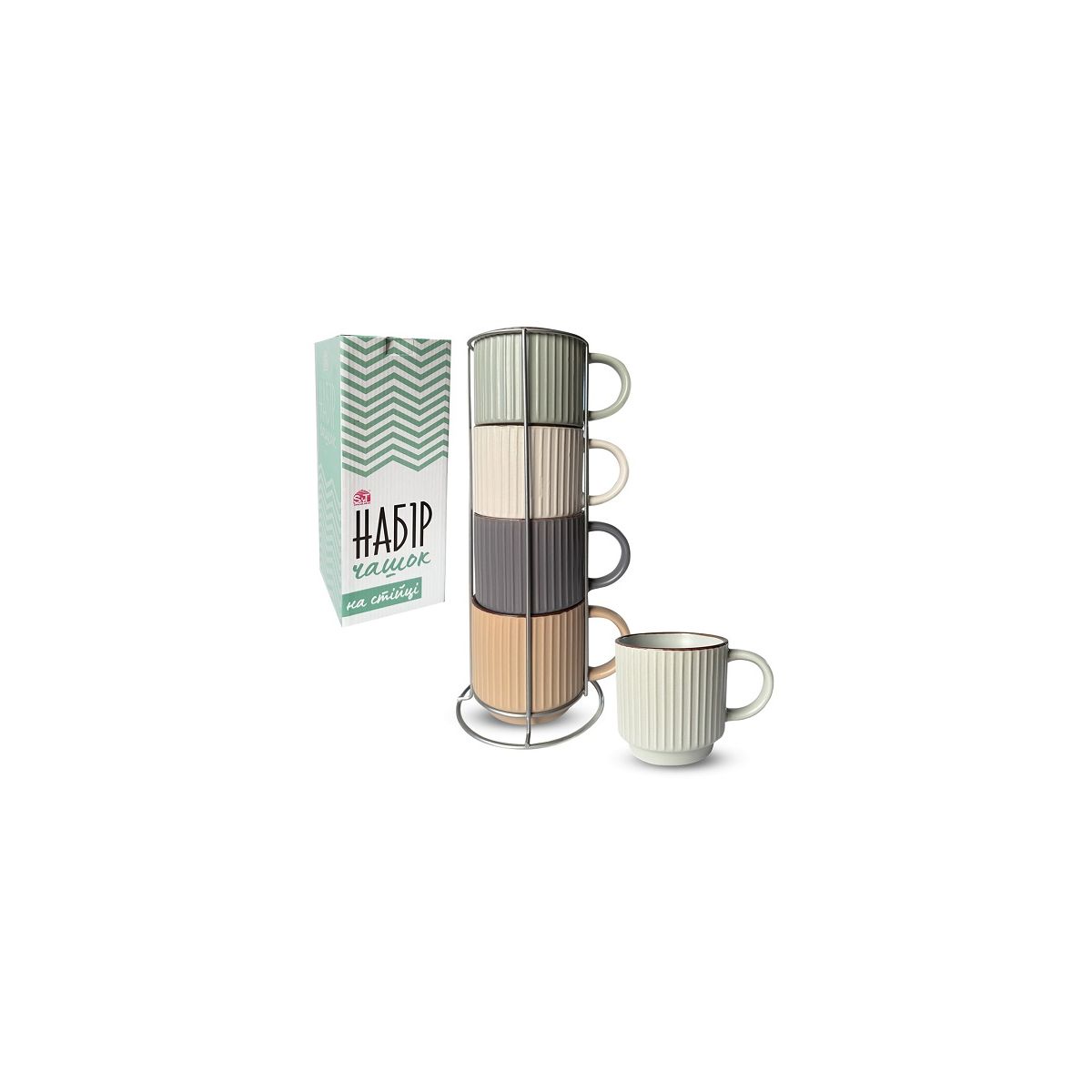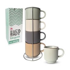 Набор из четырёх чашек объёмом 400 мл каждая, выполненный из качественных материалов, обеспечивающих долговечность и удобство использования. Чашки компактно размещаются на стильной стойке, что позволяет экономить место на кухне и поддерживать порядок. Идеально подходит для ежедневного использования дома или в офисе.