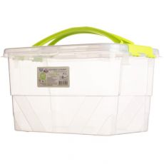 Контейнер имеет прямоугольную форму и комплектуется крышкой с ручками, которая надежно фиксируется благодаря защелкивающимся креплениям с двух сторон. Это предотвращает случайное открытие крышки и сохраняет содержимое в целости. Прозрачные стенки контейнера позволяют легко просматривать его содержимое, что упрощает поиск нужных предметов.