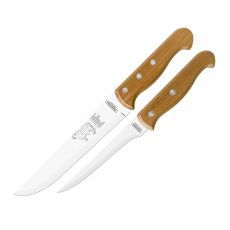 Набор приборов для гриля TRAMONTINA Barbecue, 2 предмета (22399/088) — это практичный комплект ножей, созданный специально для удобной и аккуратной работы с мясом на гриле или во время пикника. В набор входят два специализированных ножа: нож для нарезки мяса длиной 178 мм и обвалочный нож длиной 127 мм. Такой комплект позволяет легко разделывать крупные куски мяса, отделять его от кости и подготавливать порции для подачи. Лезвия изготовлены из прочной нержавеющей стали с хорошей заводской заточкой, что обеспечивает долговечность и стабильную остроту при регулярном использовании. Рукояти выполнены из натурального дерева, благодаря чему ножи удобно лежат в руке и имеют классический внешний вид, подходящий для гриль-набора. Набор относится к серии Barbecue бренда Tramontina, известного кухонными инструментами для домашнего и профессионального использования. Он отлично подходит для приготовления мяса на гриле, пикников и загородного отдыха. Важно учитывать, что ножи не предназначены для мытья в посудомоечной машине — рекомендуется ручная мойка для сохранения дерева и остроты лезвий.