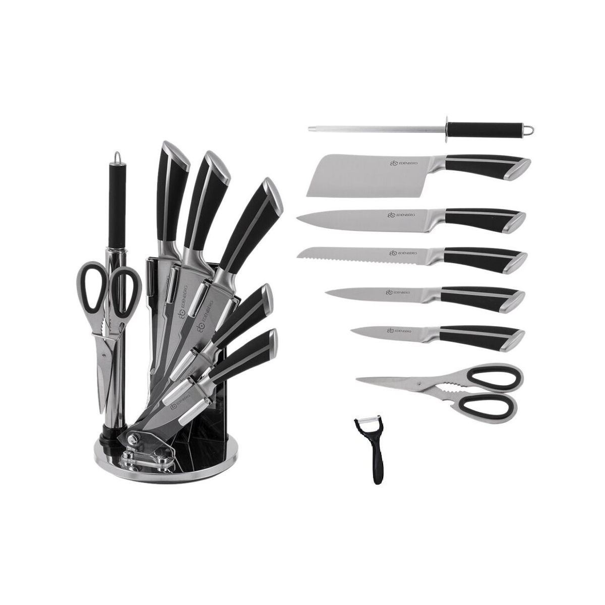 Набор ножей Edenberg EB-3611 включает в себя 5 ножей, мусат, ножницы и овощечистку. Каждый нож изготовлен изготовлен из высококачественной стали, средней плотности, что позволяет самостоятельно затачивать лезвие. Продуманная форма лезвия и ширина полотна, каленая сталь повышенной прочности, антикоррозийные свойства, характеризующийся своей уникальностью, длительный срок эксплуатации и легкость заточки выделяют данную модель из целого ряда подобных.