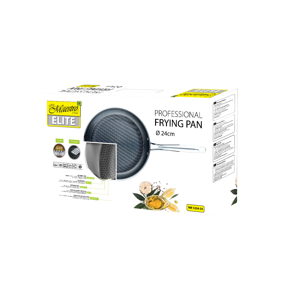 Профессиональная сковорода Maestro MR 1224-24 диаметром 24 сантиметра. Корпус сковороды Maestro MR 1224-24 имеет 3 слоя: внутренний слой изготовлен из текстурированной нержавеющей стали с антипригарным покрытием устойчивым к механическим воздействиям (можно использовать металлические лопатки), средний слой - высококачественный алюминий способствует быстрому и равномерному распределению тепла, наружный слой - нержавеющая сталь обладающая магнитными свойствами. Подходит для всех источников тепла включая индукцию.