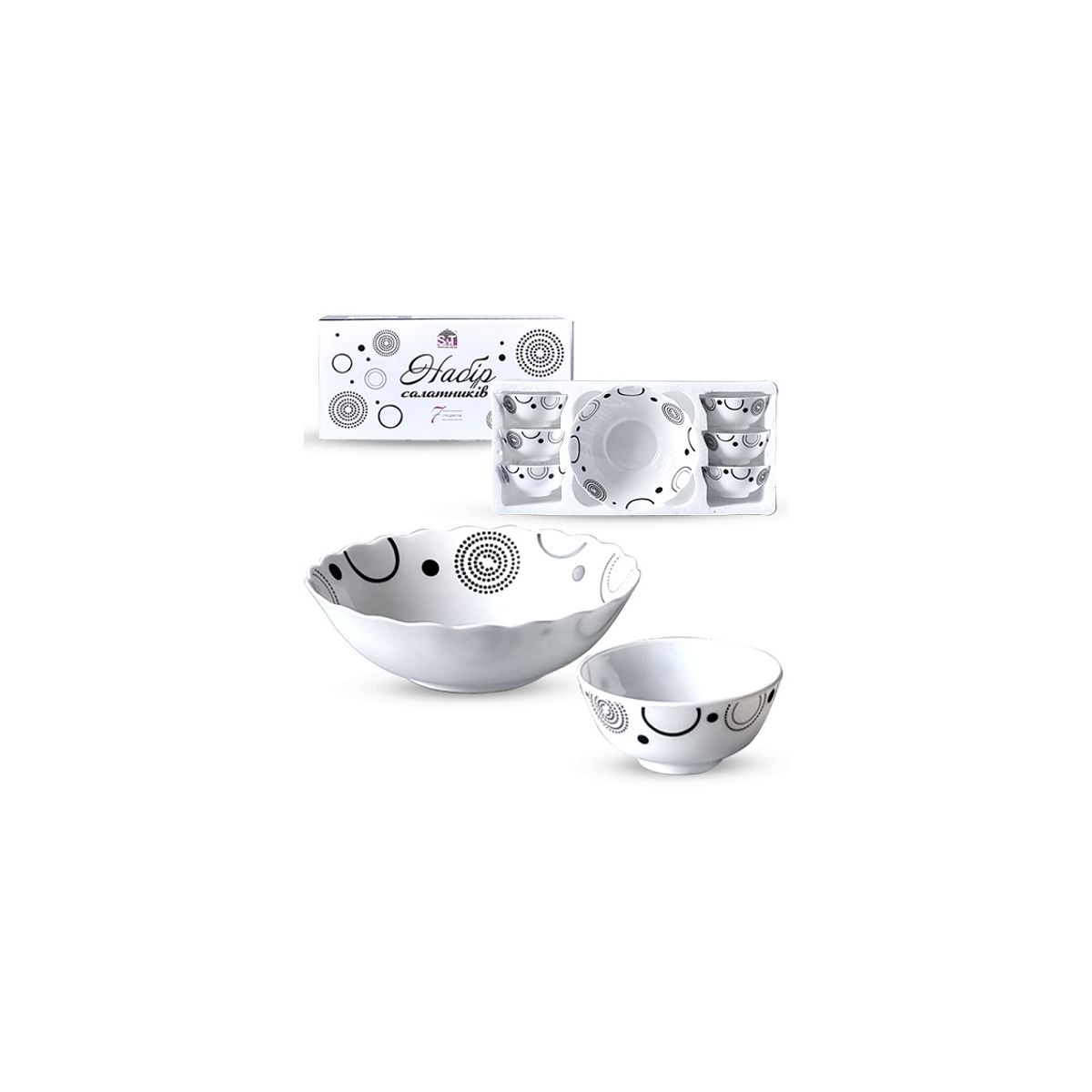 Набір салатників «Астракція» з 7 предметів стане практичним та стильним доповненням вашої кухні. У комплект входить один салатник об’ємом 800 мл та шість салатників по 260 мл, що зручно для подачі як великих, так і порційних страв. Виготовлені з якісного та міцного матеріалу, легко миються та підходять для щоденного використання. Чудовий вибір для сервірування салатів, закусок та десертів.